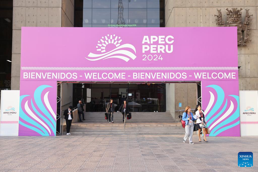 People walk past the logo of APEC 2024 outside the Lima Convention Center in Lima, Peru, Nov. 13, 2024. The 31st APEC Economic Leaders' Meeting will be held in Lima. (Xinhua/Mariana Bazo)