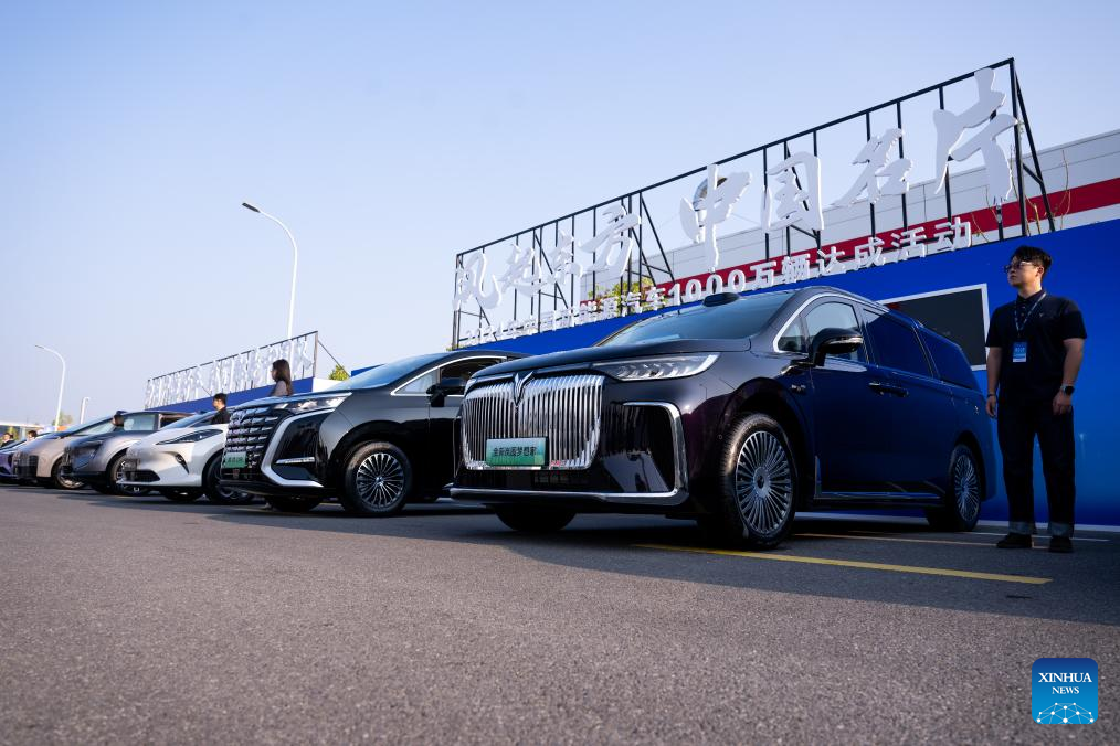New energy vehicles (NEVs) of Chinese brands are displayed at a ceremony marking the 10 million milestone that China's NEV annual production has surpassed for the first time, in Wuhan, central China's Hubei Province, Nov. 14, 2024.