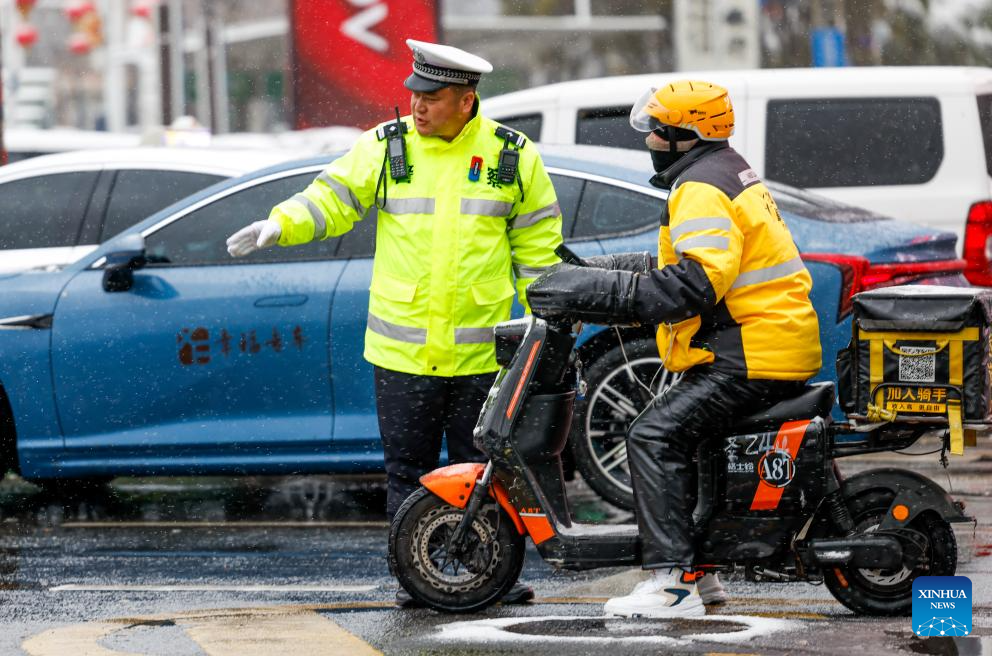 A traffic police officer reminds a deliveryman to pay attention to slippery road conditions in Urumqi, northwest China's Xinjiang Uygur Autonomous Region, Nov. 14, 2024. A cold front has ushered in significant drop in temperature and snowfall across Xinjiang. (Xinhua/Wang Fei)