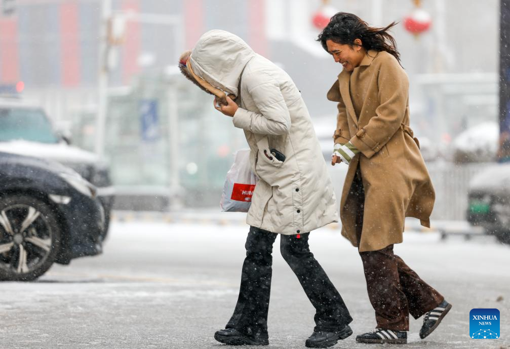 People walk in Urumqi, northwest China's Xinjiang Uygur Autonomous Region, Nov. 14, 2024. A cold front has ushered in significant drop in temperature and snowfall across Xinjiang. (Xinhua/Wang Fei)