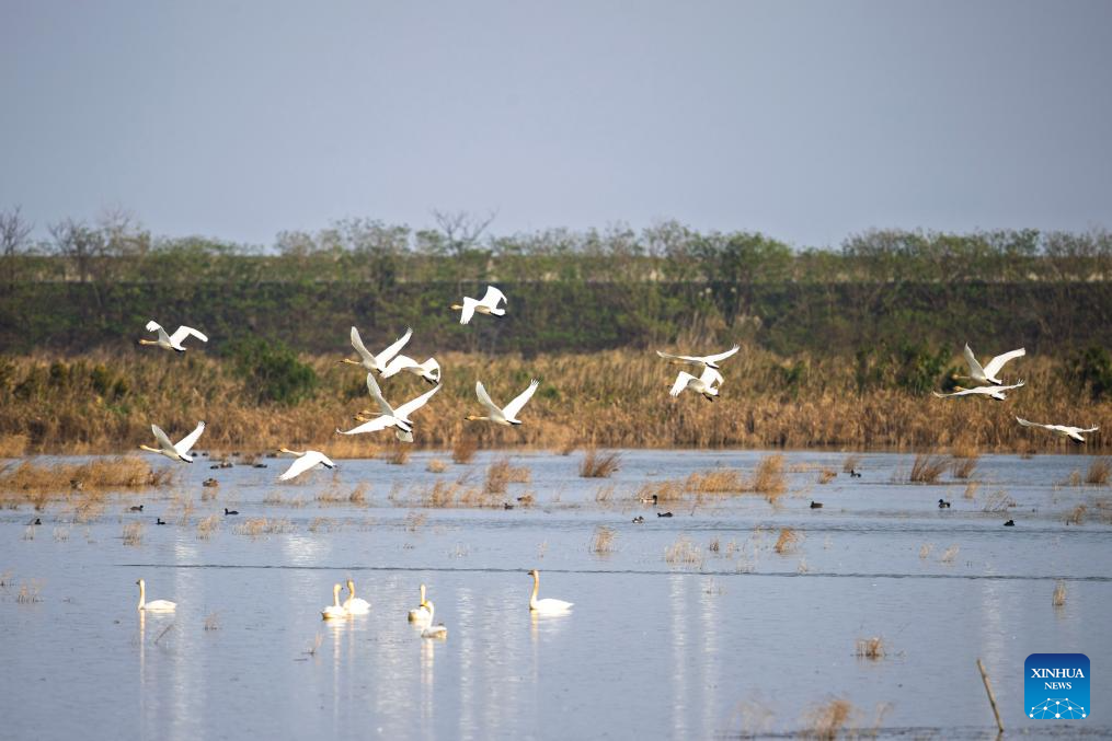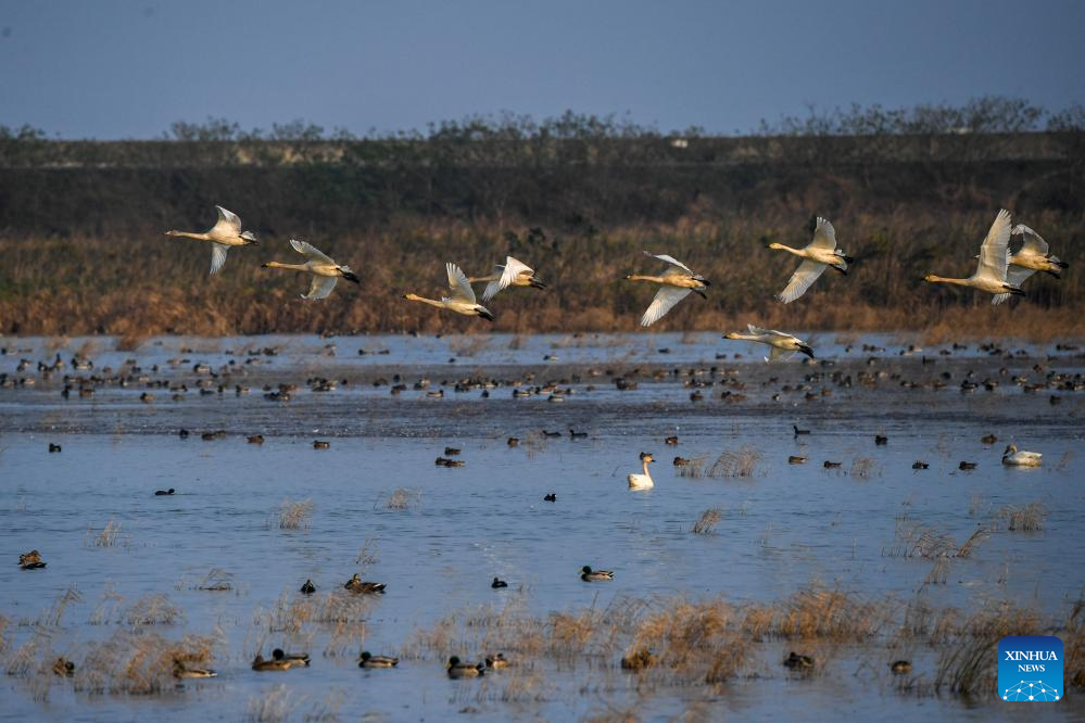 Trundra swans fly over Chongming Dongtan National Nature Reserve in east China's Shanghai, Nov. 12, 2024. A large number of migrant birds winter at the reserve. (Xinhua/Li Bo)