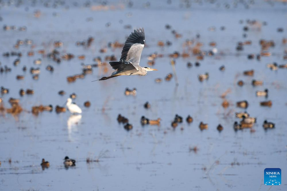 A heron flies at Chongming Dongtan National Nature Reserve in east China's Shanghai, Nov. 12, 2024. A large number of migrant birds winter at the reserve. (Xinhua/Li Bo)