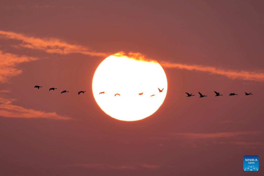 Tundra swans fly over Chongming Dongtan National Nature Reserve at sunset in east China's Shanghai, Nov. 12, 2024. A large number of migrant birds winter at the reserve. (Xinhua/Li Bo)