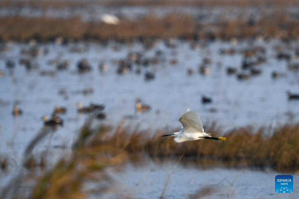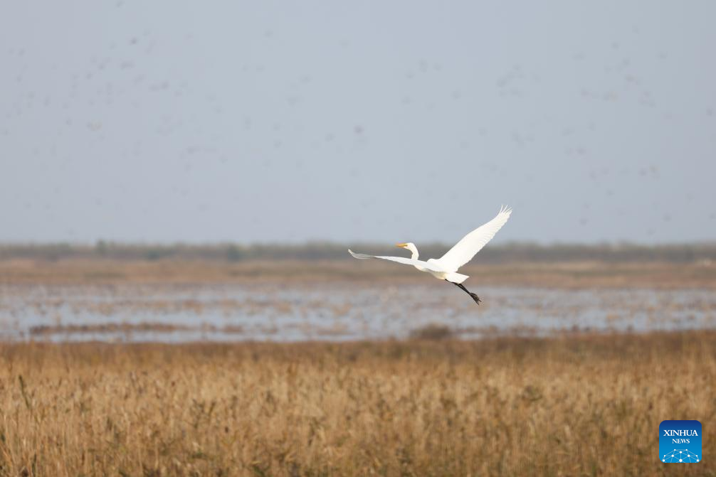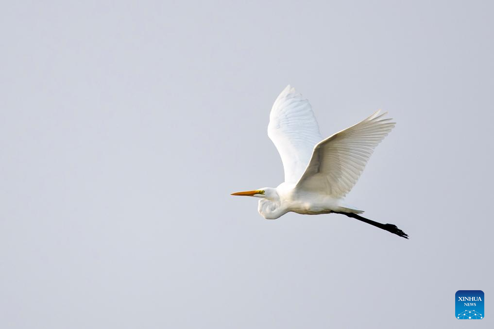 An egret flies at Chongming Dongtan National Nature Reserve in east China's Shanghai, Nov. 12, 2024. A large number of migrant birds winter at the reserve. (Xinhua/Li Bo)