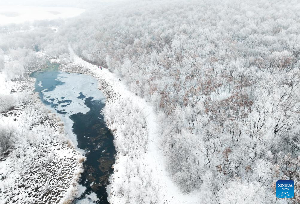 Tourists enjoy the rime scenery in Morin Dawa Daur Autonomous Banner, north China's Inner Mongolia Autonomous Region, Nov. 14, 2024. (Xinhua/Lian Zhen)