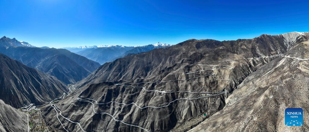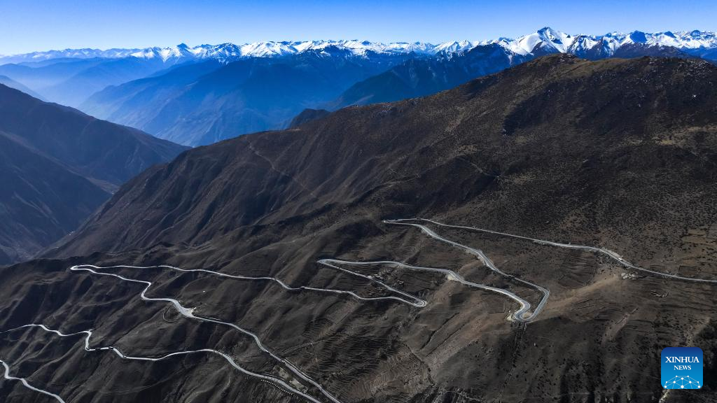 An aerial drone photo taken on Nov. 16, 2024 shows part of Nujiang River zigzag road on the Sichuan-Xizang highway in Baxoi County, southwest China's Xizang Autonomous Region. (Xinhua/Kelsang Namgyai)