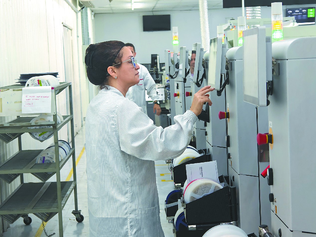A local employee of Chinese company TCL checks the operation of equipment in a workshop of a television manufacturing base owned by the company in Manaus in Brazil's Amazonas state. (People's Daily/Xu Hailin)