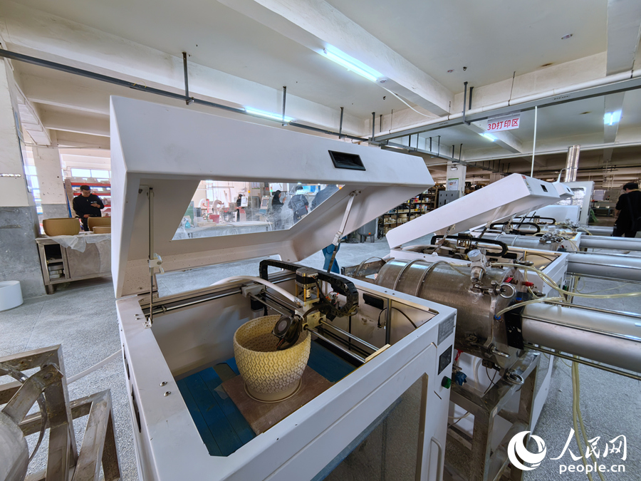 A 3D printer produces a ceramic product at a company in Dehua county, Quanzhou, southeast China's Fujian Province. (People's Daily Online/Su Haisen)