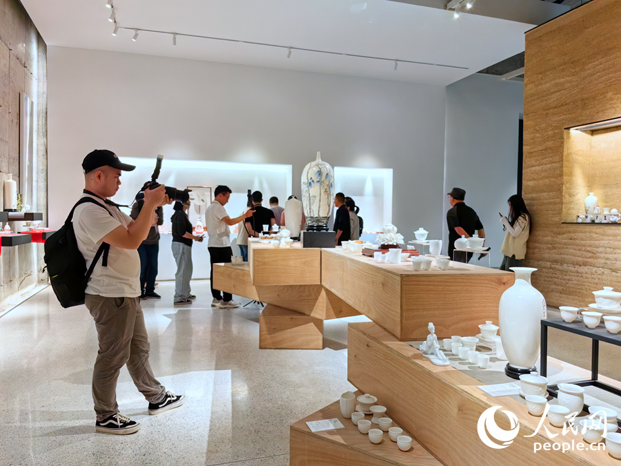Visitors observe ceramic products at a ceramic art museum in Dehua county, Quanzhou, southeast China's Fujian Province. (People's Daily Online/Su Haisen)