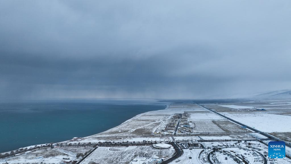 An aerial drone photo taken on Nov. 18, 2024 shows a snow scenery of Qinghai Lake in northwest China's Qinghai Province. (Xinhua/Zhang Long)