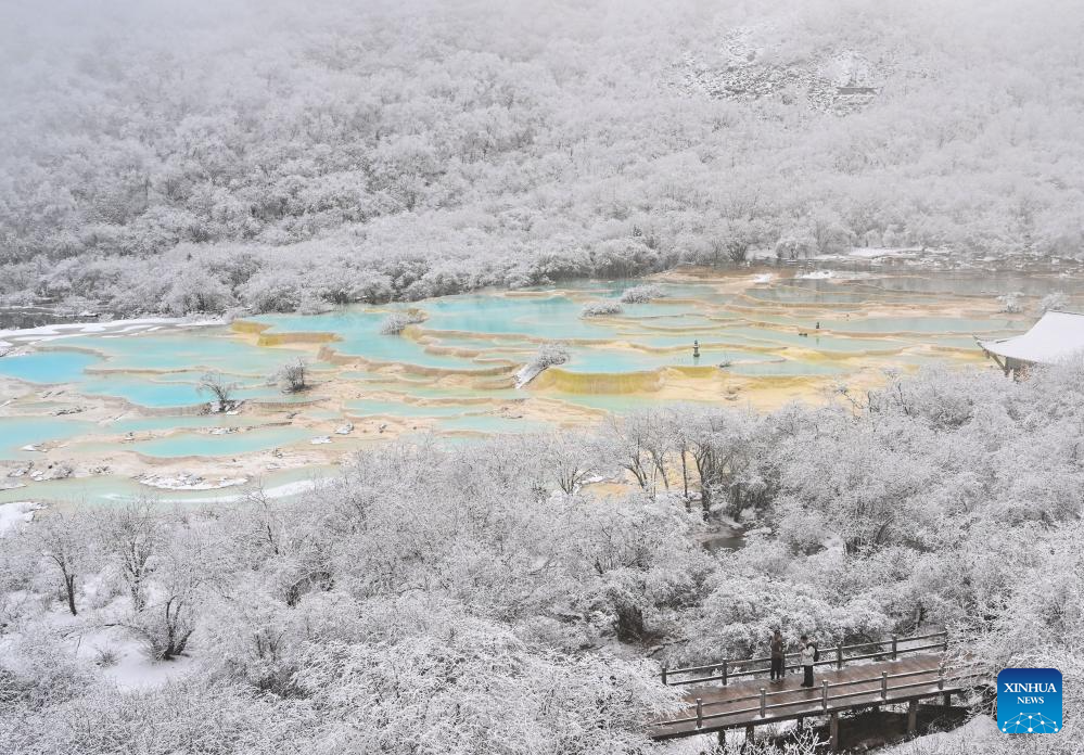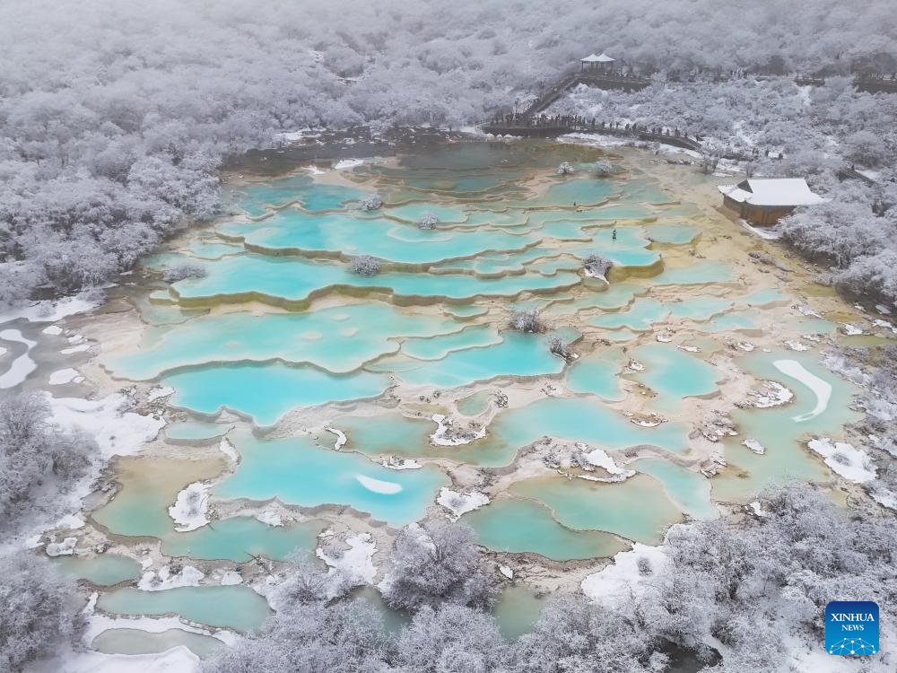 An aerial drone photo taken on Nov. 18, 2024 shows a view of a colorful pond cluster at Huanglong scenic area after snow in Tibetan-Qiang Autonomous Prefecture, southwest China's Sichuan Province. (Xinhua/Liu Lianfen)