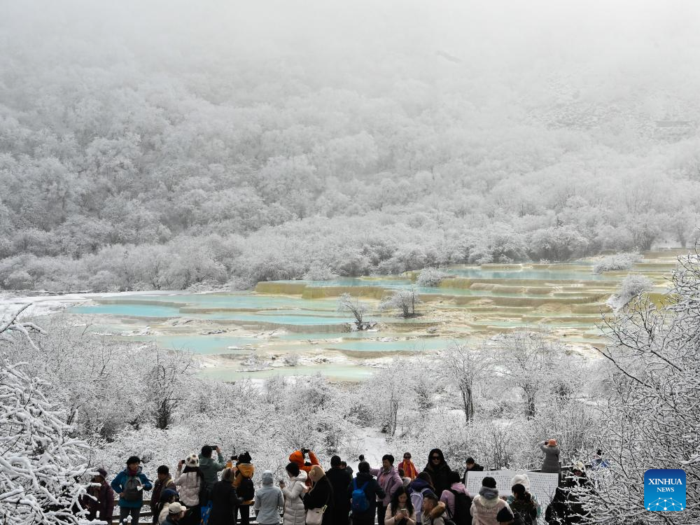 This photo taken on Nov. 18, 2024 shows tourists viewing a colorful pond cluster at Huanglong scenic area after snow in Tibetan-Qiang Autonomous Prefecture, southwest China's Sichuan Province. (Xinhua/Liu Lianfen)