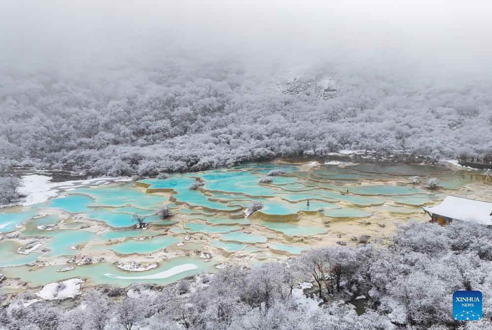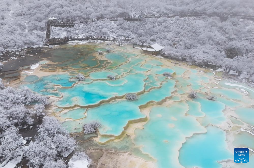 An aerial drone photo taken on Nov. 18, 2024 shows a view of a colorful pond cluster at Huanglong scenic area after snow in Tibetan-Qiang Autonomous Prefecture, southwest China's Sichuan Province. (Xinhua/Wang Xi)