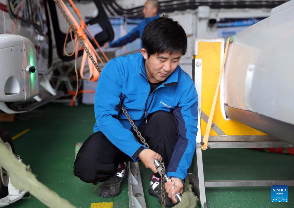 Helicopter crew member Bi Lingfeng works aboard China's research icebreaker Xuelong 2. Currently on China's 41st Antarctic expedition, research icebreakers Xuelong and Xuelong 2, or Snow Dragon and Snow Dragon 2, will begin to plough through the belt of prevailing westerlies, nicknamed the "rolling forties," on Tuesday. (Xinhua/Huang Taoming)