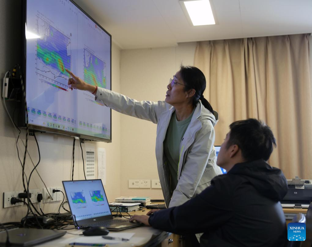Meteorologist Liu Sufang (L) studies weather conditions and plans navigation route aboard China's research icebreakers Xuelong 2. Currently on China's 41st Antarctic expedition, research icebreakers Xuelong and Xuelong 2, or Snow Dragon and Snow Dragon 2, will begin to plough through the belt of prevailing westerlies, nicknamed the "rolling forties," on Tuesday. (Xinhua/Huang Taoming)