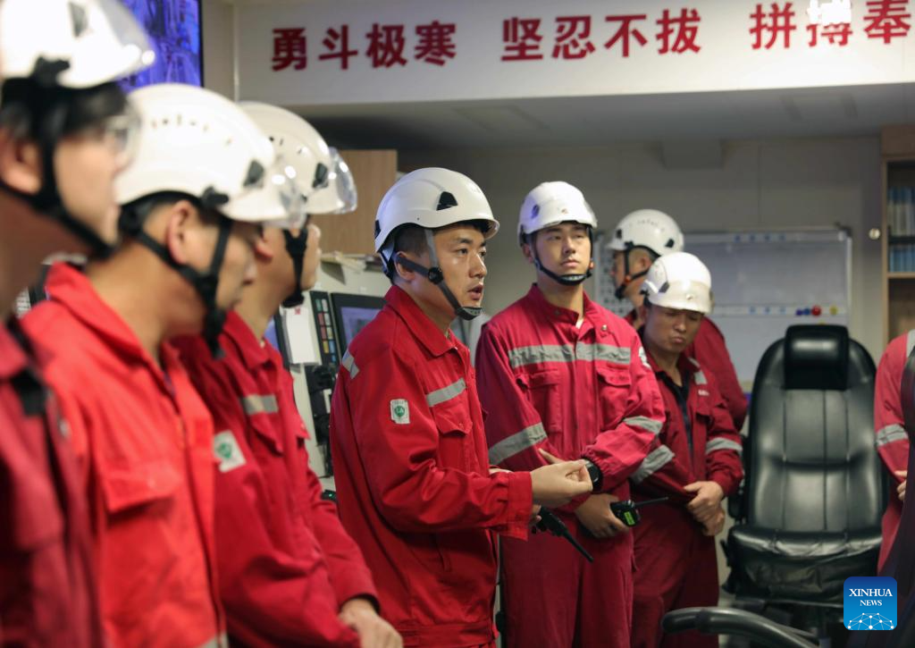 Chief engineer Li Wenming (4th L) speaks after a power loss drill aboard China's research icebreaker Xuelong 2. Currently on China's 41st Antarctic expedition, research icebreakers Xuelong and Xuelong 2, or Snow Dragon and Snow Dragon 2, will begin to plough through the belt of prevailing westerlies, nicknamed the "rolling forties," on Tuesday. (Xinhua/Huang Taoming)