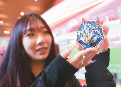 A visitor displays a creative cultural product inspired by an exquisitely delicate empress crown from ancient China at the National Museum of China. (Photo /Chen Xiaogen)