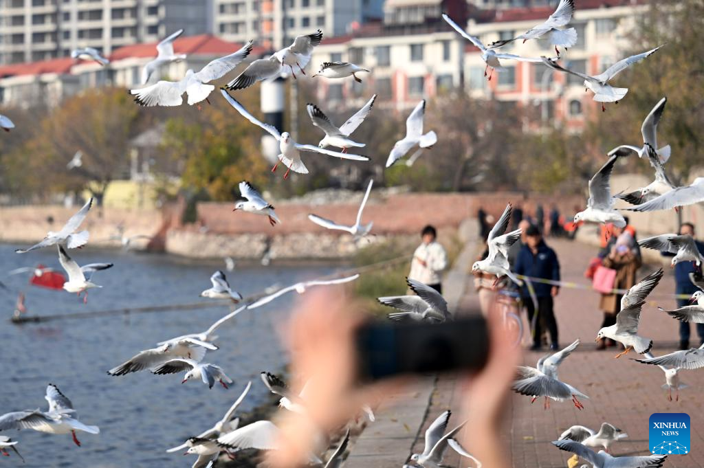 People view seagulls by the Haihe River in north China's Tianjin Municipality, Nov. 19, 2024. Thousands of seagulls have recently flocked to an obsolete dock by the Haihe River, turning it into a tourist attraction. (Xinhua/Zhao Zishuo)