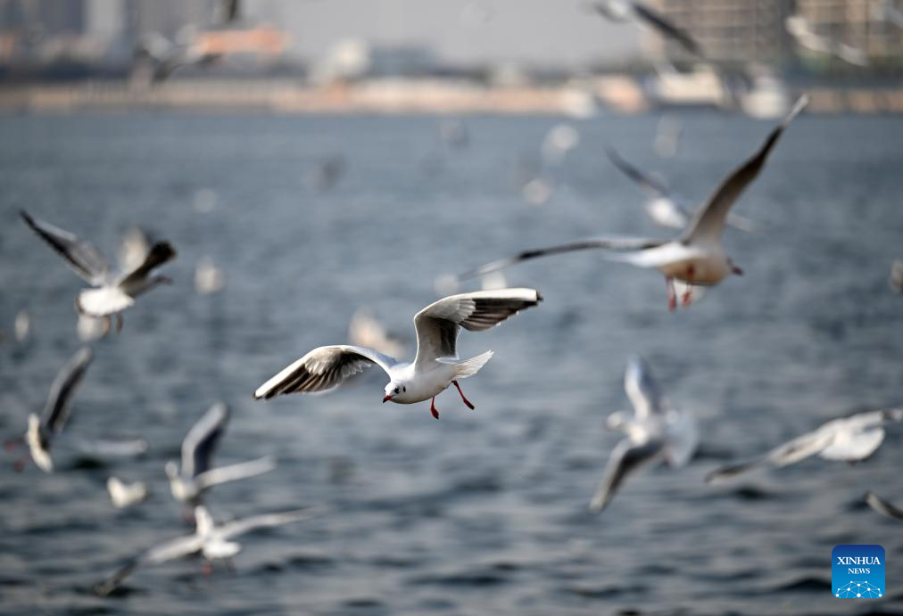 Seagulls fly above the Haihe River in north China's Tianjin Municipality, Nov. 19, 2024. Thousands of seagulls have recently flocked to an obsolete dock by the Haihe River, turning it into a tourist attraction. (Xinhua/Zhao Zishuo)