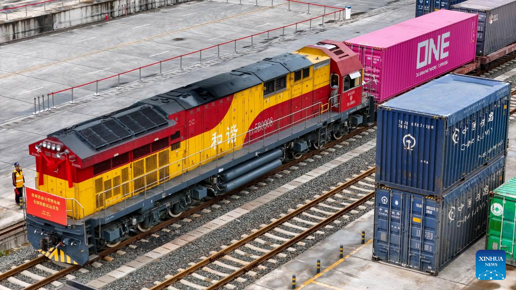 A train loaded with lithium batteries for traction purposes is pictured at Dulaying international land-sea logistics port in Guiyang, southwest China's Guizhou Province, Nov. 19, 2024. Three trains loaded with lithium batteries for traction purposes departed separately from Chongqing, Guiyang and Yibin on Tuesday, marking the first large scale test run for rail transportation of such batteries in China.