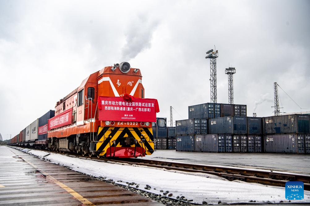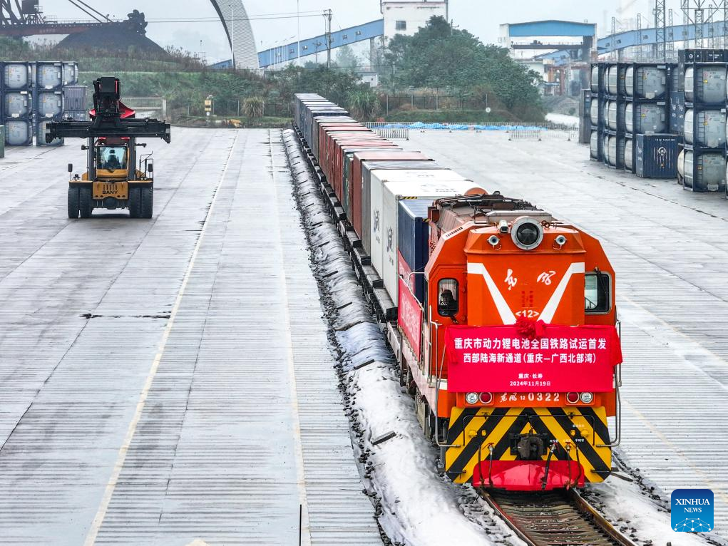 A train loaded with lithium batteries for traction purposes departs from a train station in southwest China's Chongqing, Nov. 19, 2024. Three trains loaded with lithium batteries for traction purposes departed separately from Chongqing, Guiyang and Yibin on Tuesday, marking the first large scale test run for rail transportation of such batteries in China. A new type of container enhanced with multiple safety measures including smoke sensing and pressure releasing has been deployed to effectively reduce potential risks during transportation. (Xinhua/Zhang Ziyu)