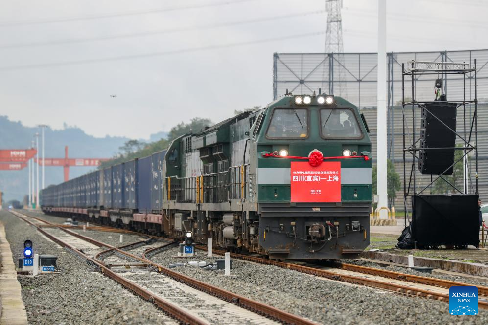 A train loaded with lithium batteries for traction purposes is about to depart from Yibin Port in Yibin, southwest China's Sichuan Province, Nov. 19, 2024. Three trains loaded with lithium batteries for traction purposes departed separately from Chongqing, Guiyang and Yibin on Tuesday, marking the first large scale test run for rail transportation of such batteries in China.
