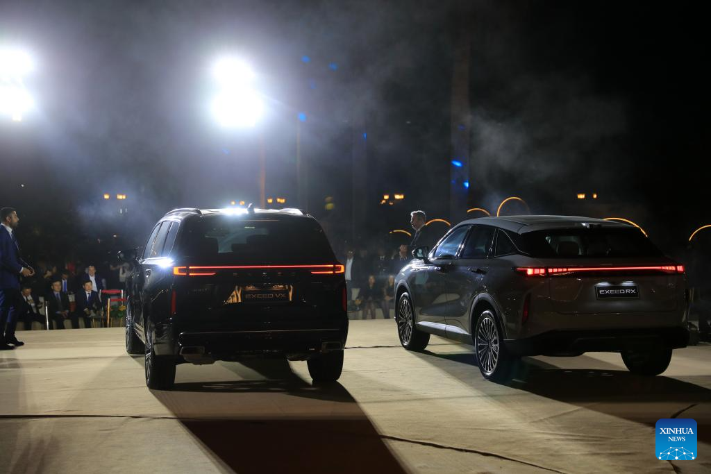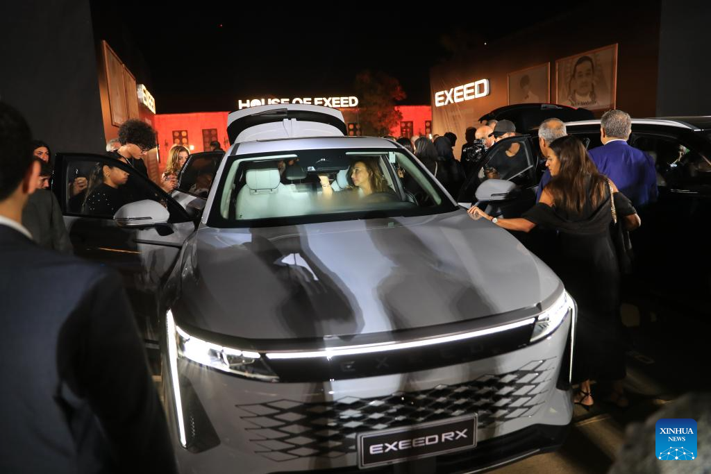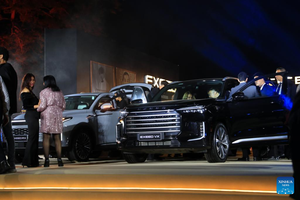 People attend a launching ceremony of two Exeed SUV models in northern Great Cairo, Egypt, on Nov. 18, 2024. Chinese premium automotive brand Exeed, a subsidiary of automaker Chery, has introduced two SUV models, the Exeed RX and Exeed VX, to the Egyptian market. (Xinhua/Sui Xiankai)