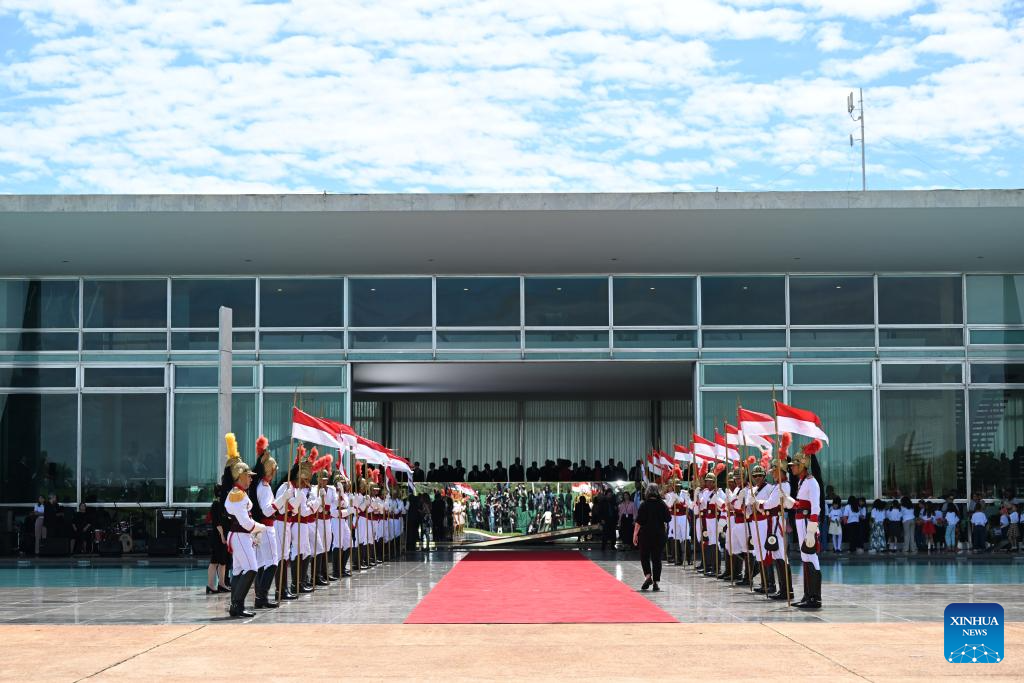 Brazilian President Luiz Inacio Lula da Silva and his wife Rosangela da Silva warmly welcome Chinese President Xi Jinping and hold a grand welcome ceremony for Xi, prior to the talks between Xi and Lula, in Brasilia, Brazil, Nov. 20, 2024. Xi on Wednesday held talks with Lula in Brasilia. (Xinhua/Li Xueren)