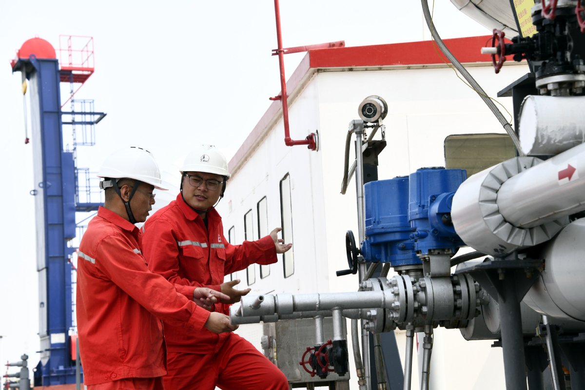Sinopec employees check CCUS equipment operations in Dongying, Shandong province. (Photo/Xinhua)