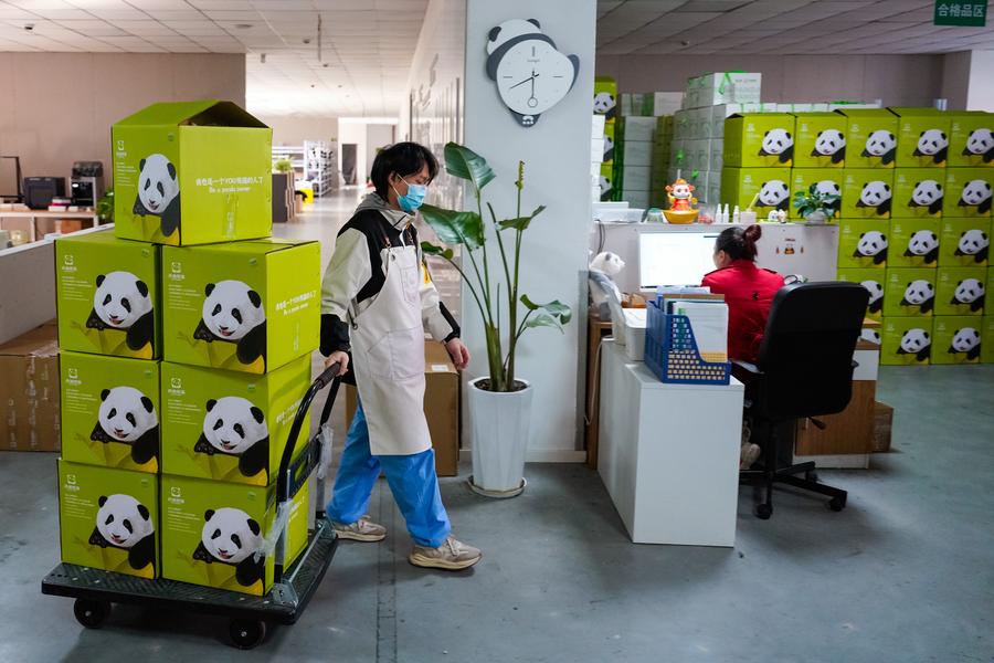 Staff members transport the packed panda toys at the workshop of SeeU Panda in Chengdu, southwest China's Sichuan Province, Nov. 21, 2024. (Xinhua/Shen Bohan)