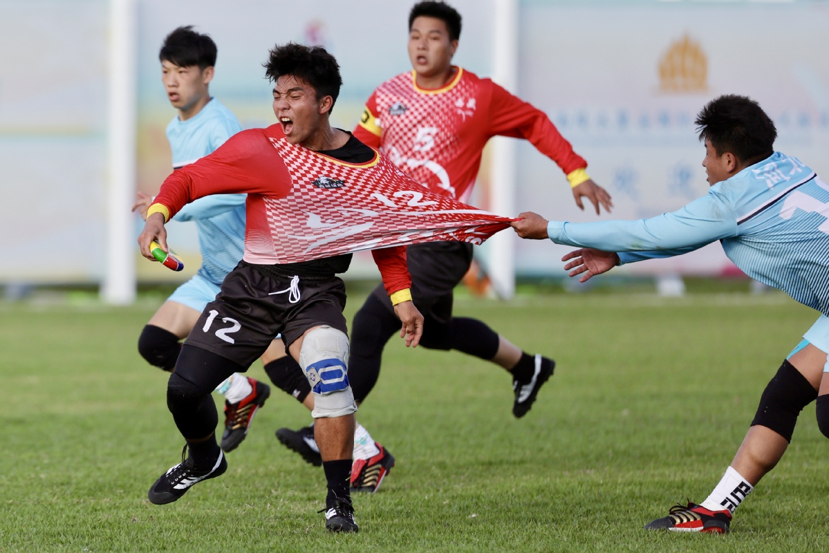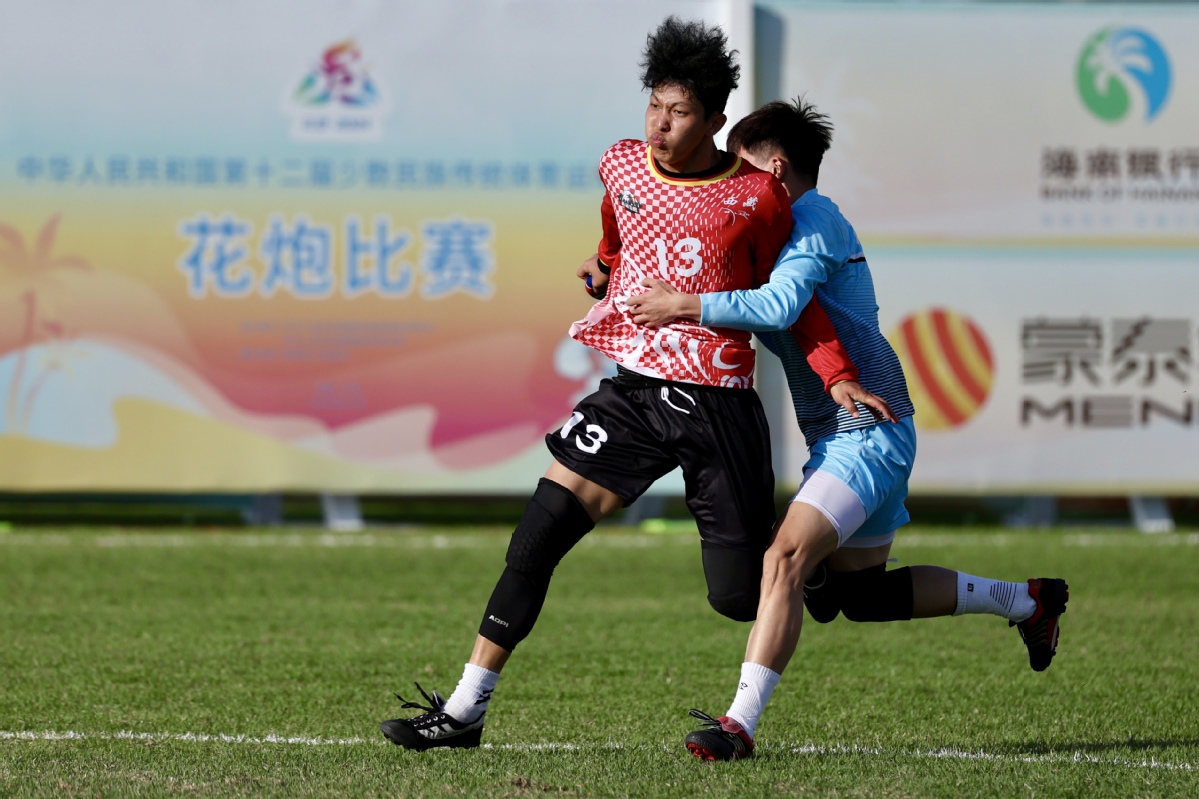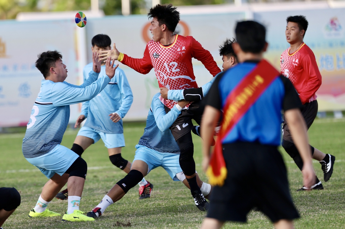 Huapao, a traditional Chinese rugby-like sport is played between teams from Xizang autonomous region (red) and Hebei at the 12th National Traditional Games of Ethnic Minorities of the People's Republic of China on Saturday in South China's Hainan province. The Hebei team lost at 1:3. (Photo by Wei Xiaohao/chinadaily.com.cn)
