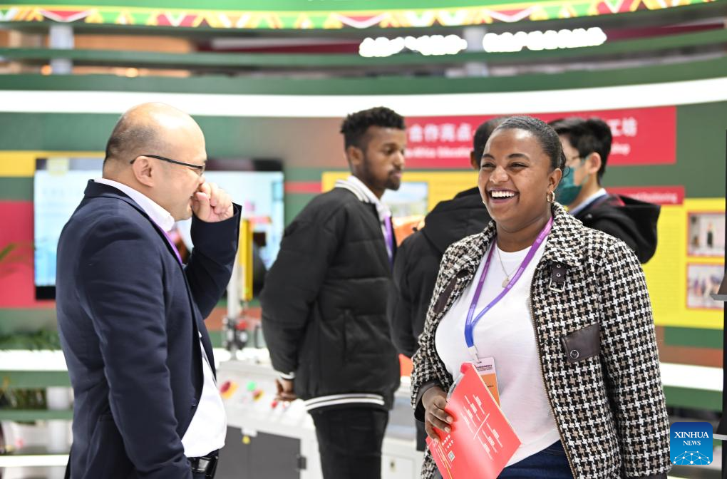 Kalkidan (1st R) introduces an industrial robot training platform to a visitor at the booth of Ethiopian Luban Workshop during the 2024 World Vocational and Technical Education Development Conference in Tianjin, north China, Nov. 22, 2024. (Xinhua/Zhao Zishuo)