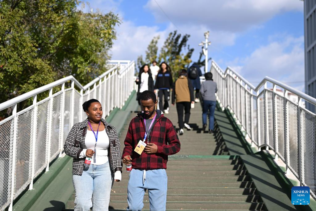 Kalkidan (L) walks downstairs with her schoolmate at the Tianjin University of Technology and Education in Tianjin, north China, Nov. 22, 2024. (Xinhua/Li Ran)