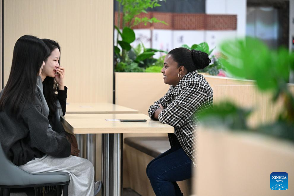 Kalkidan talks with her schoolmates at a canteen of the Tianjin University of Technology and Education in Tianjin, north China, Nov. 21, 2024. (Xinhua/Zhao Zishuo)