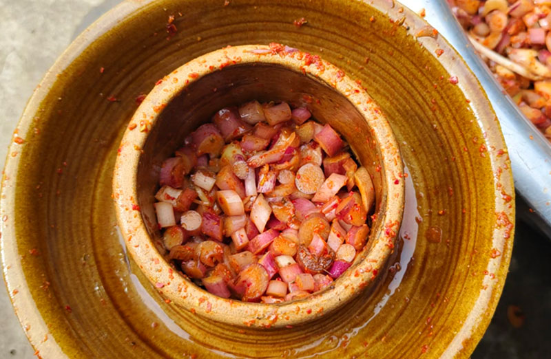 Then there's the pickled sour taro stalks—a dish made from seemingly ordinary taro stalks. Washed, chopped, and mixed with chili, Sichuan peppercorns, and sugar, the taro stalks are left to ferment in jars. The result is a tangy side dish perfect for stimulating the appetite.