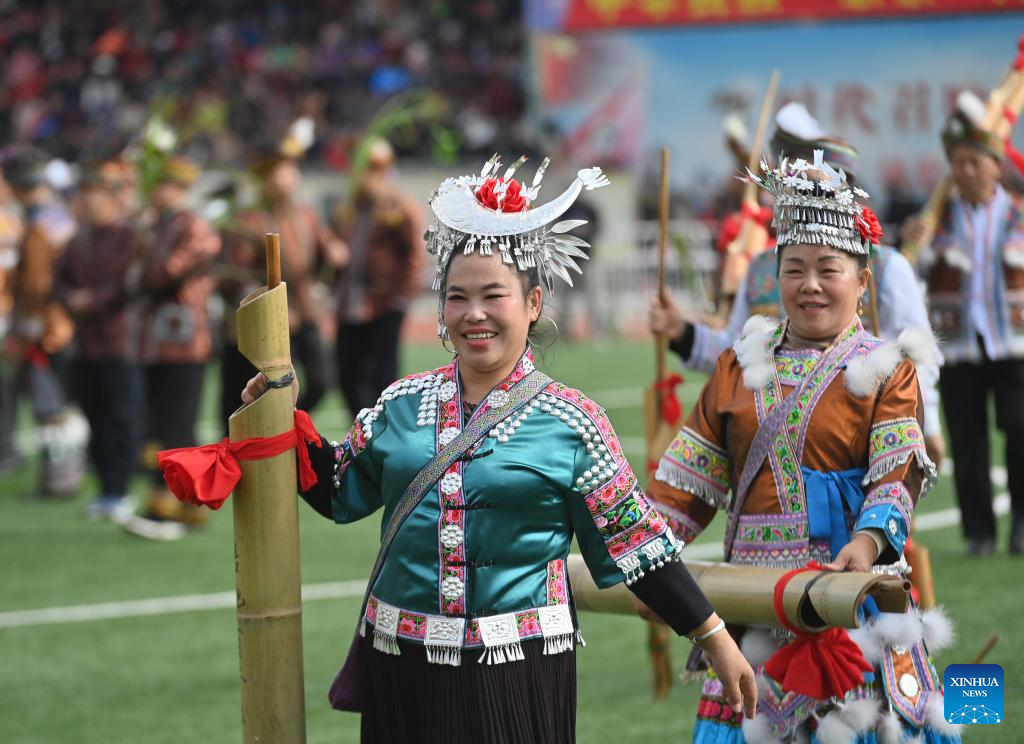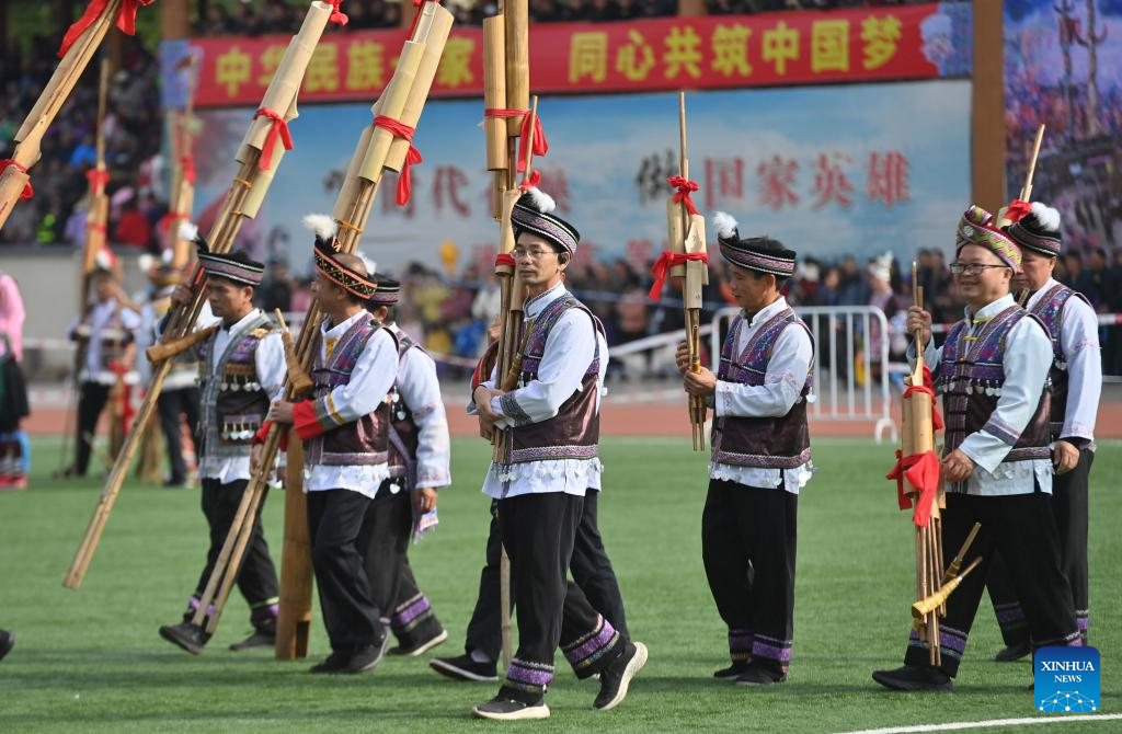 People in traditional costumes participate in Lusheng and horse fighting festival held in Rongshui Miao Autonomous County of Liuzhou, south China's Guangxi Zhuang Autonomous Region, Nov. 23, 2024. Lusheng is a folk musical instrument made of bamboo pipes. (Xinhua/Huang Xiaobang)