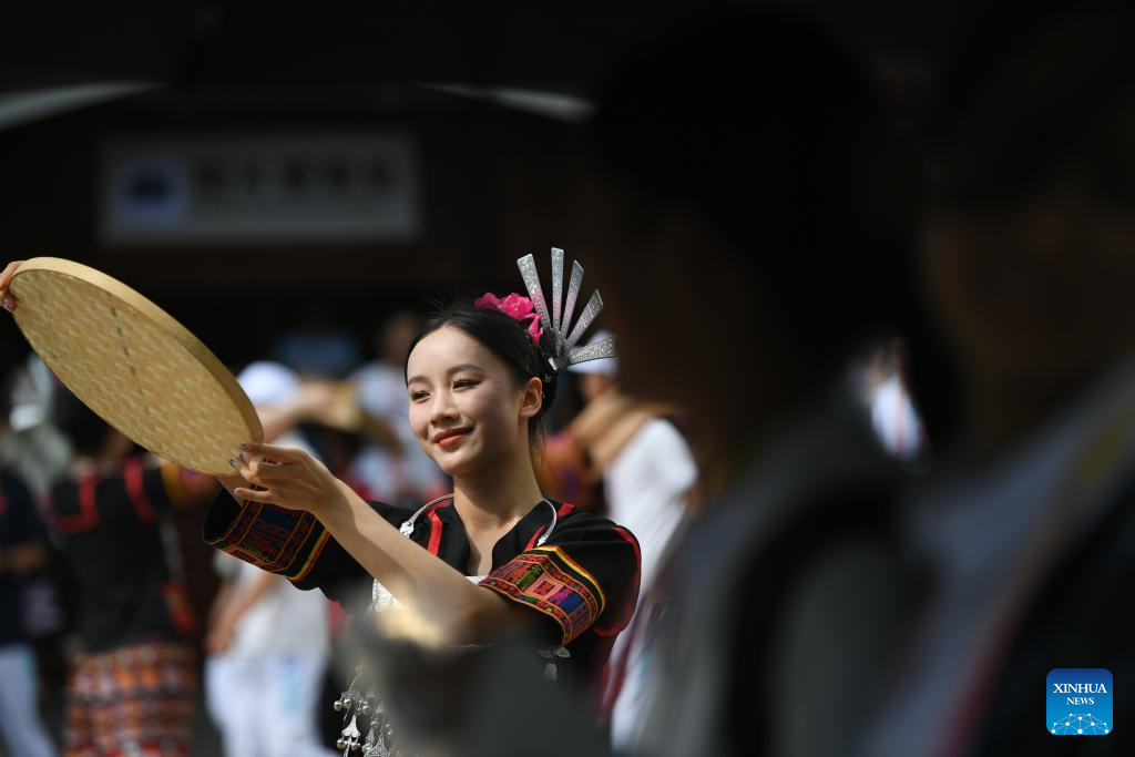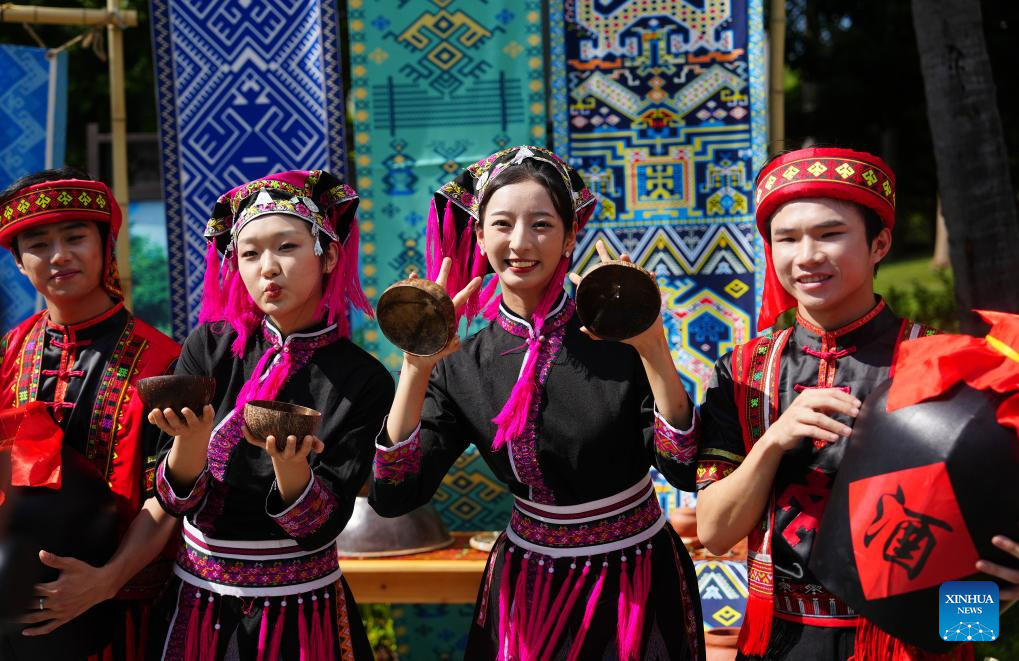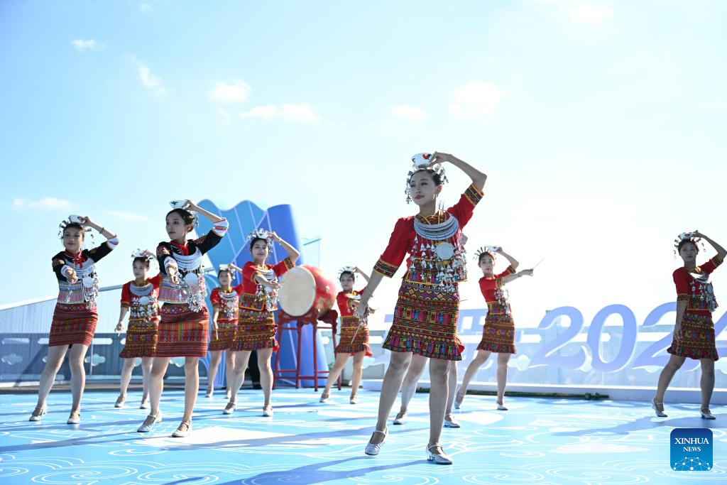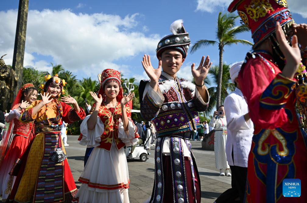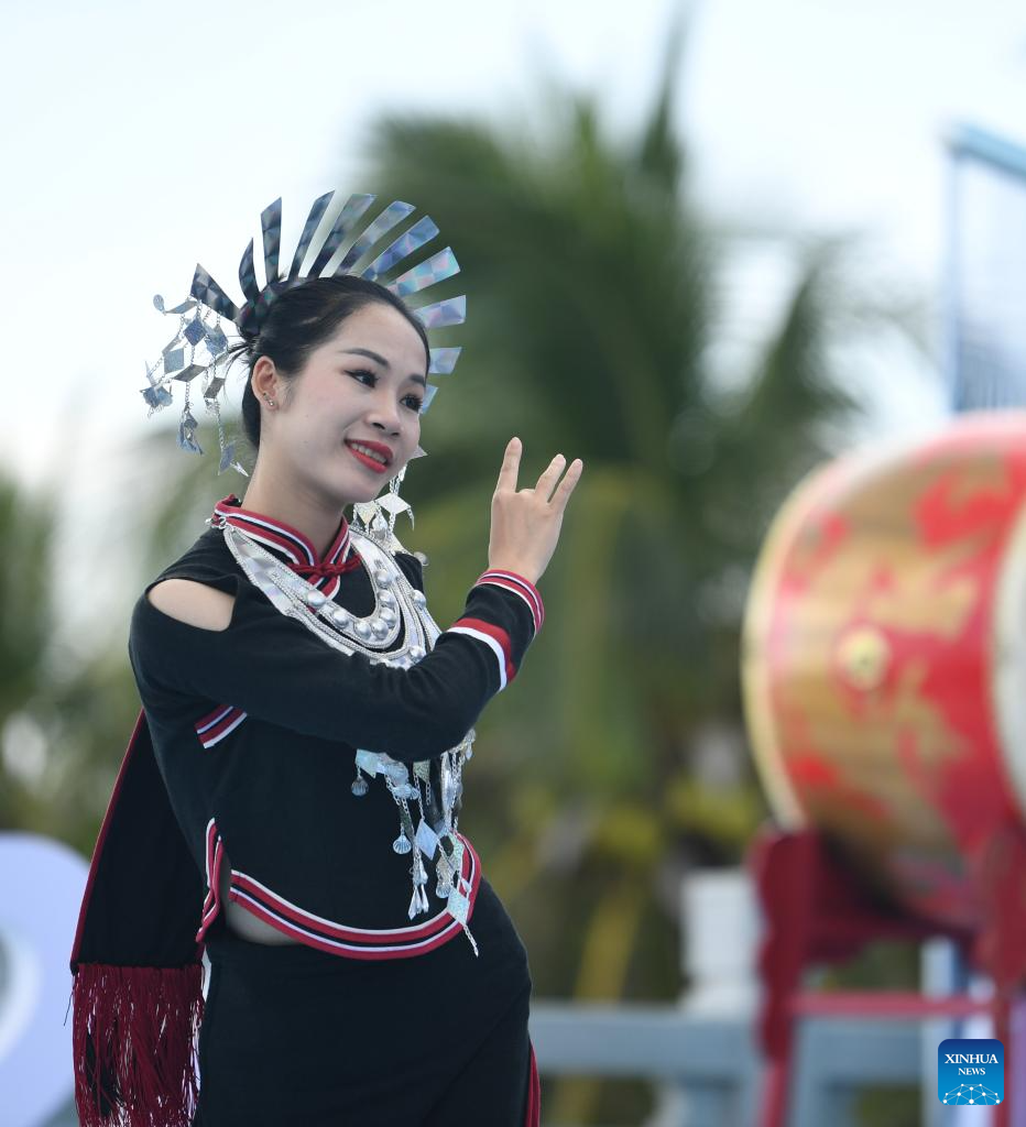 Artists welcome guests during a performance gala of the 12th National Traditional Games of Ethnic Minorities of China in Sanya, south China's Hainan Province, Nov. 26, 2024. (Xinhua/Yang Wenbin)
