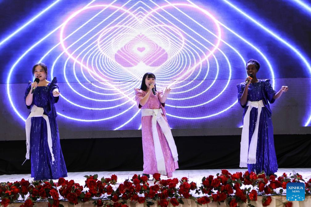 Chinese language teachers perform during the 10th anniversary celebration of Confucius Institute at Makerere University in Kampala, Uganda, on Nov. 25, 2024. The Confucius Institute at Makerere University, Uganda's premier institution, celebrated its 10th anniversary Monday, marking a decade of fostering cultural and linguistic exchanges between China and Uganda. (Photo by Hajarah Nalwadda/Xinhua)