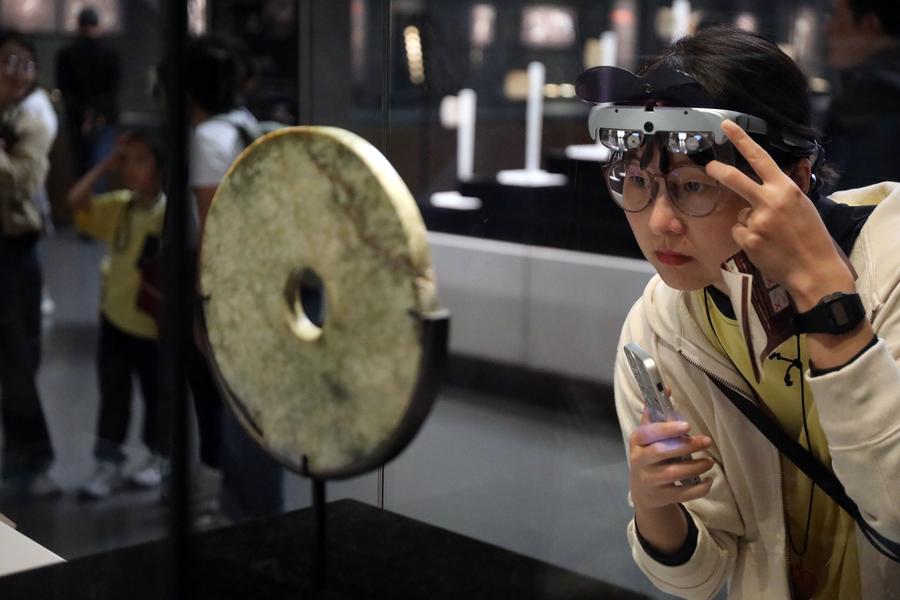 A tourist views an exhibit at Liangzhu Museum in Hangzhou, capital of east China's Zhejiang Province, Oct. 5, 2024. (Photo by Xu Junyong/Xinhua)