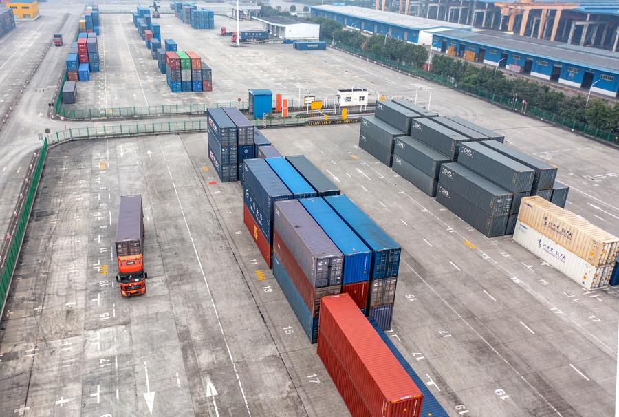 An aerial drone photo taken on March 7, 2024 shows containers waiting to go through customs clearance at a railway station in Chongqing, southwest China. (Xinhua/Huang Wei)