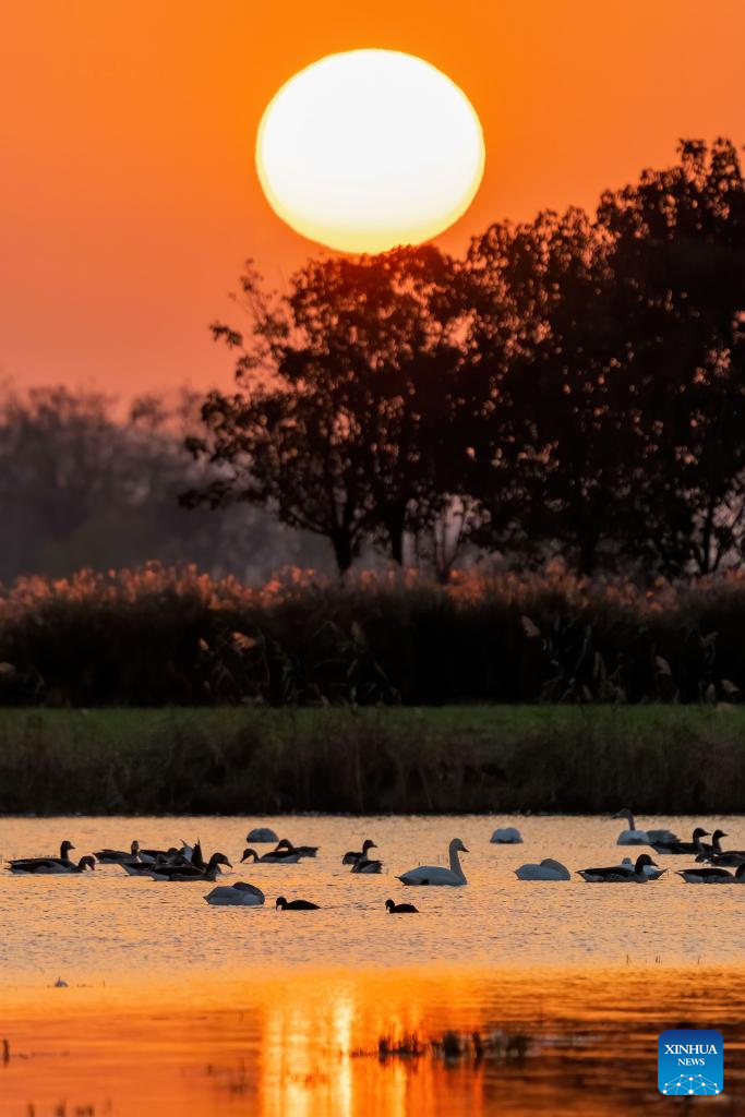 Swans are seen at a wetland in Feidong County of Hefei, east China's Anhui Province, Nov. 30, 2024. (Photo by Ruan Xuefeng/Xinhua)