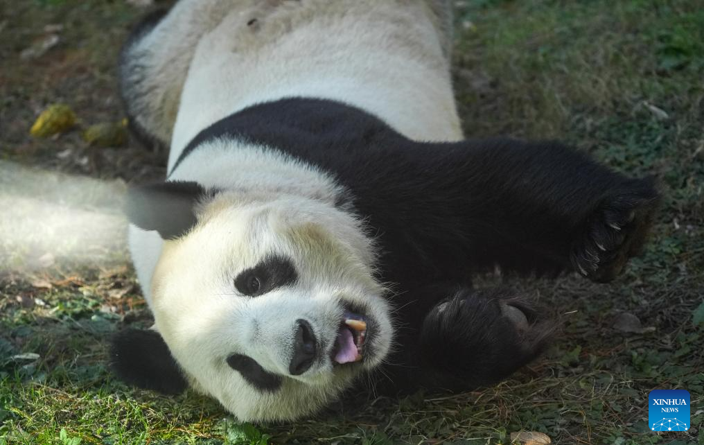 Giant panda Fu Bao stretches itself at a wildlife zoo in Tangshan tourist resort in Nanjing, east China's Jiangsu Province, Dec. 1, 2024. Seven giant pandas, all of them guests from the China Conservation and Research Center for Giant Pandas, have attracted thousands of eyes as they enjoyed food and sunshine in public on a warm winter day. (Xinhua/Yang Lei)