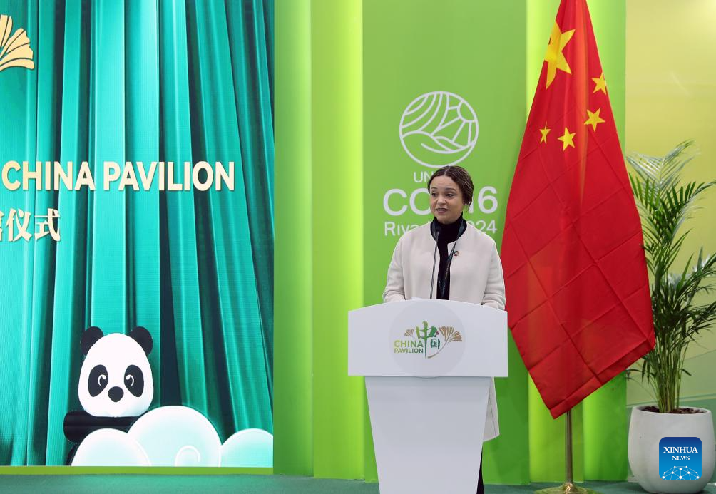 UNCCD Deputy Executive Secretary Andrea Meza Murillo speaks at the opening ceremony of the China Pavilion at the 16th Conference of the Parties (COP16) to the United Nations Convention to Combat Desertification (UNCCD) in Riyadh, Saudi Arabia, on Dec. 2, 2024. The China Pavilion at the 16th Conference of the Parties (COP16) to the United Nations Convention to Combat Desertification (UNCCD) officially opened on Monday, highlighting China's decades-long efforts and achievements in combating desertification. (Xinhua/Wang Dongzhen)