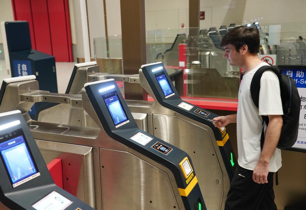 James Patrick from Canada experiences contactless fare payments in rail transit for foreign MasterCard and Visa card holders at the Xinshougang (Shougang Park) Subway Station in Beijing, capital of China, Sept. 13, 2024. (Xinhua/Zhang Chenlin)