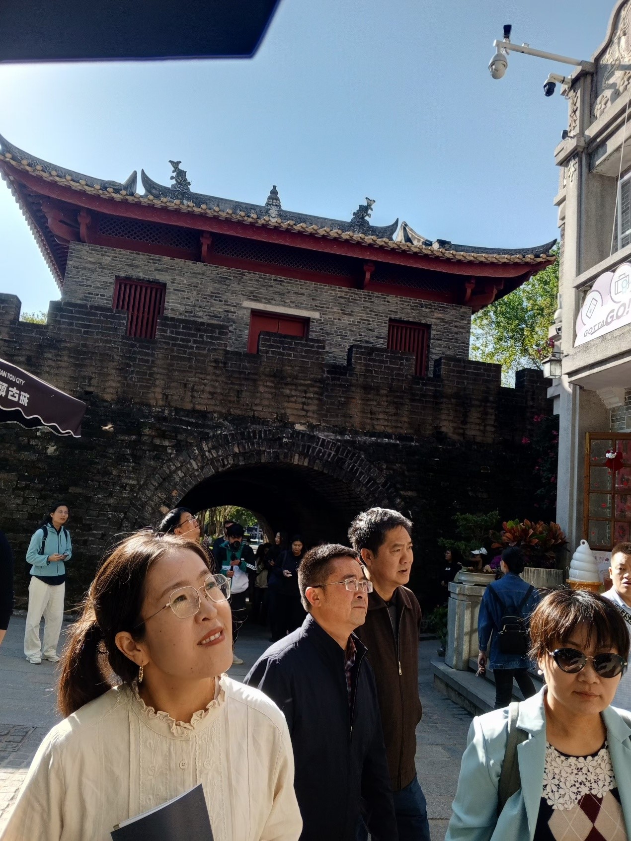 Visitors and journalists explore the Nantou Ancient City in Nanshan district, south China's Shenzhen, Nov. 28, 2024. Behind them stands the South Gate, remarkably well-preserved and a symbol of the city's centuries-old heritage. (Photo/People's Daily Online)