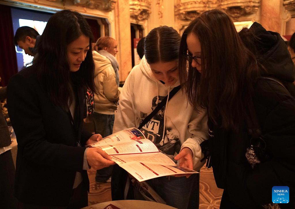 Visitors read introductions at the "Study in China" education exhibition in Prague, the Czech Republic, on Dec. 2, 2024. Thirteen Chinese universities showcased their diverse programs and policies at the "Study in China" education exhibition held in Prague on Monday, underscoring the deepening educational and cultural ties between China and the Czech Republic. (Photo by Dana Kesnerova/Xinhua)