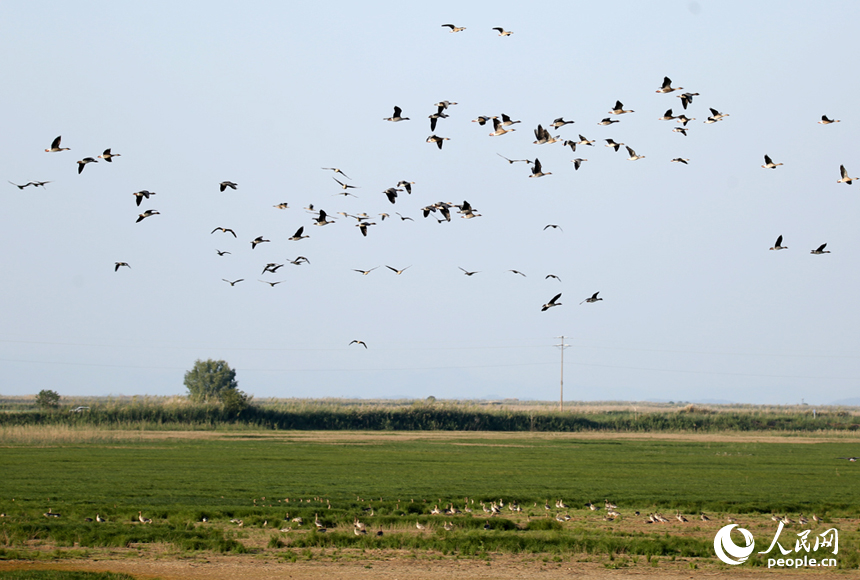 Photo shows large flocks of wintering migratory birds arriving at Poyang Lake, China's largest freshwater lake, as winter approaches. (People's Daily Online/Shi Yu)