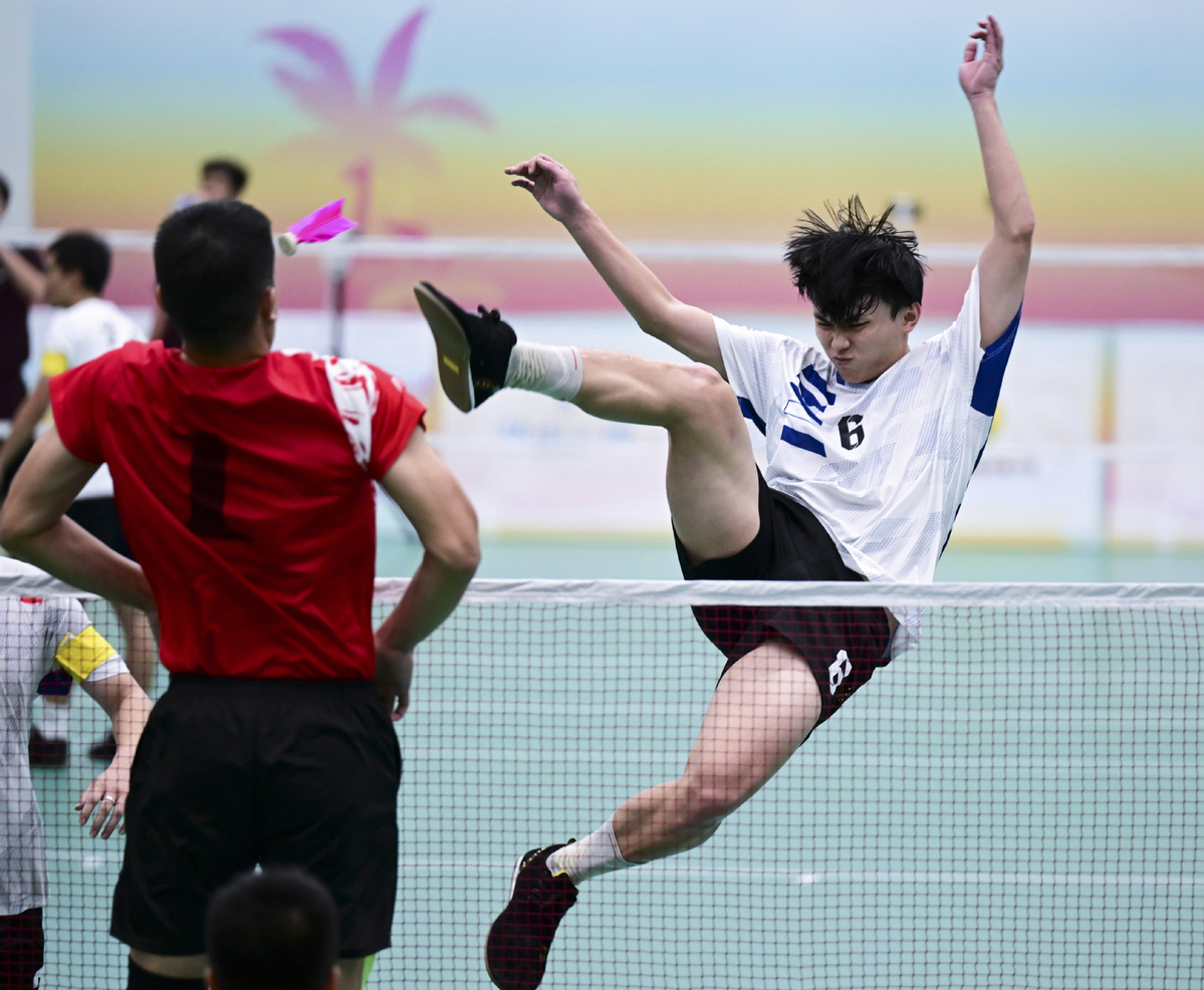 Guangxi team player Zuo Zheng (right) kicks a shuttlecock in a Jianqiu game at the 12th National Traditional Games of Ethnic Minorities of the People's Republic of China on Nov 28, 2024, in Sanya, South China's Hainan province. The sport is often played on a badminton-sized court, following volleyball-like rules. (Photo/Xinhua)