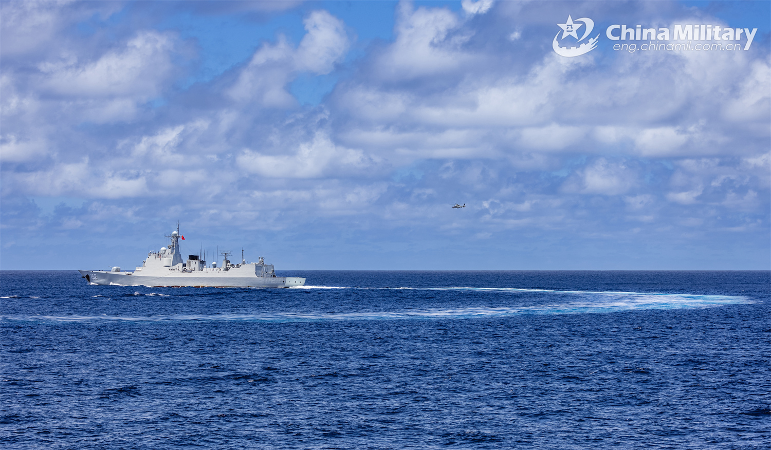 A destroyer and a comprehensive supply ship attached to a naval fleet of the Chinese People's Liberation Army (PLA) conduct the alongside replenishment operation during a replenishment-at-sea training exercise on November 8, 2024. (eng.chinamil.com.cn/Photo by Wan Haichao)