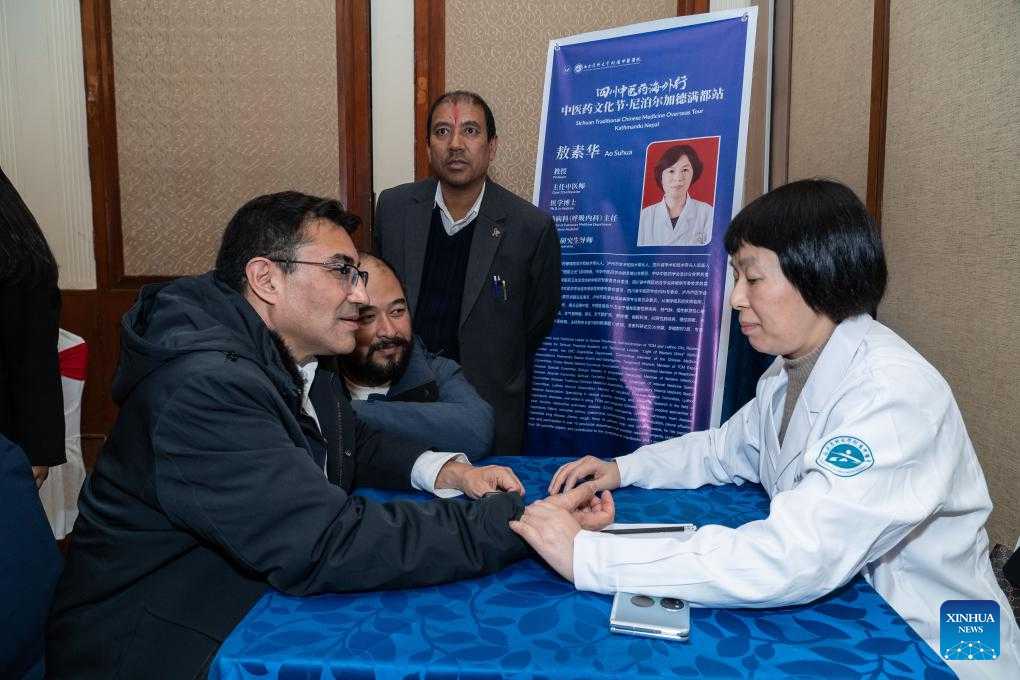 A doctor from the Affiliated Traditional Chinese Medicine Hospital of Southwest Medical University makes a free diagnosis during a traditional Chinese medicine (TCM) overseas tour in Kathmandu, Nepal, on Dec. 3, 2024. (Photo by Hari Maharjan/Xinhua)